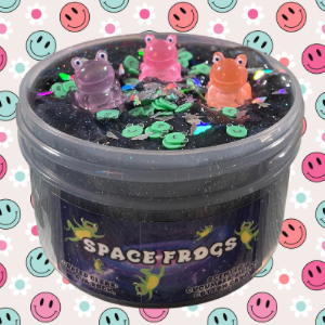 Blast off with our "Frogs in Space" slime! This cosmic creation features a coated clear base tinted to mimic the mysterious depths of outer space, sprinkled with volcanic lava rocks for stellar texture. Adorable frog fimos and charming space-themed trinkets float throughout this galactic goo. The unexpected blend of cucumber melon and cotton candy scents creates an out-of-this-world sensory experience that's totally ribbiting! Perfect for earthlings who love to squish, stretch, and explore the slime universe!