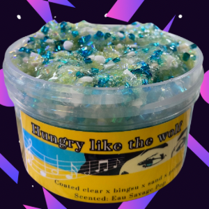 Introducing Hungry like the wolf, the ultimate slime experience! This clear coated slime is infused with bingsu, sand, and perlite for a one-of-a-kind texture that's crunchy and sizzles. With a scent that will drive your senses wild, you'll be howling for more!
