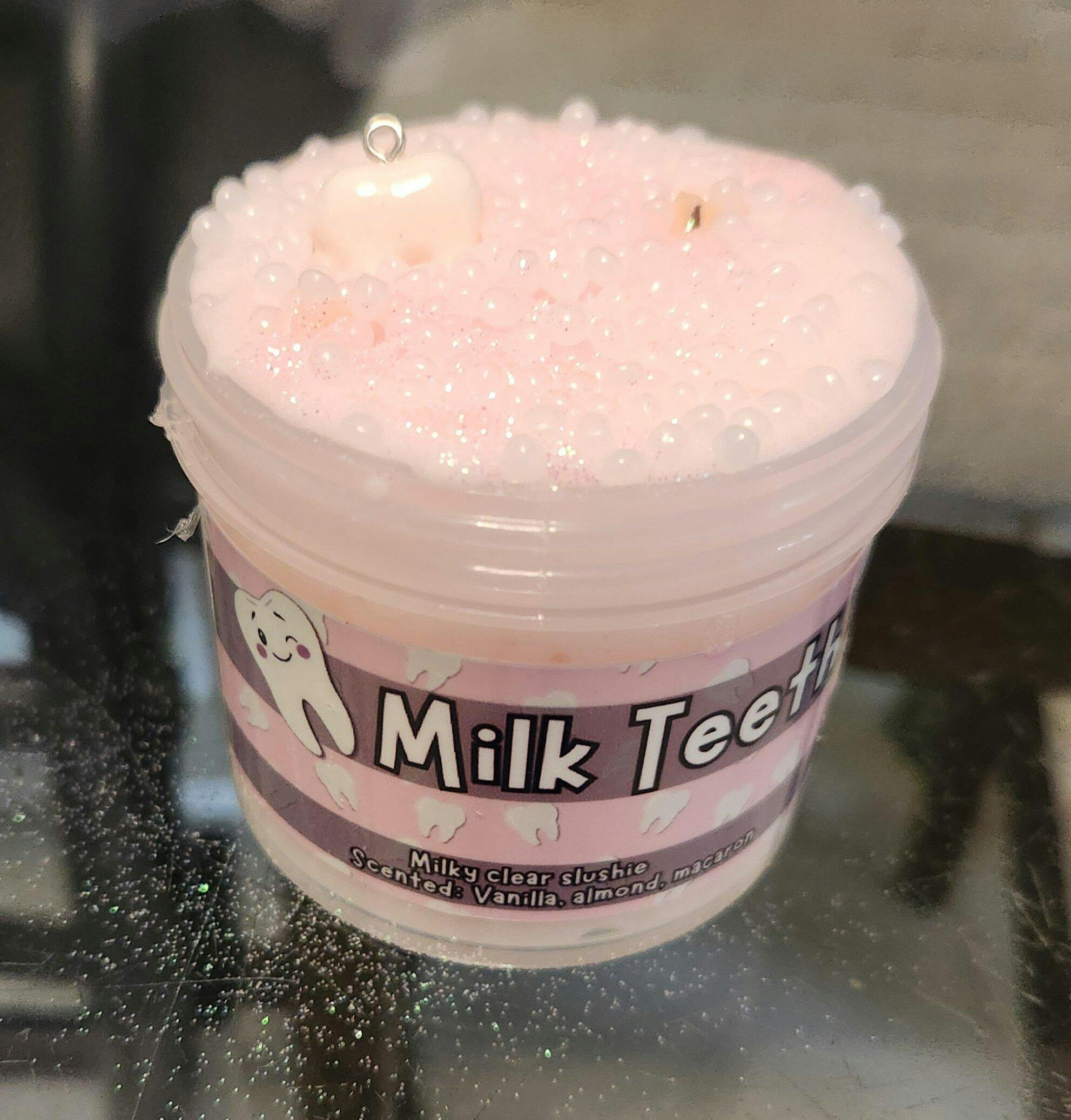 Milk Teeth is a cute yet slightly eerie slime that captivates with its baby pink milky clear base, filled with slushie beads for a satisfying texture. Its unique scent of vanilla almond macaron adds a sweet twist, making the experience both fun and unexpectedly adorable. Perfect for those who love a little quirky charm in their slime collection!